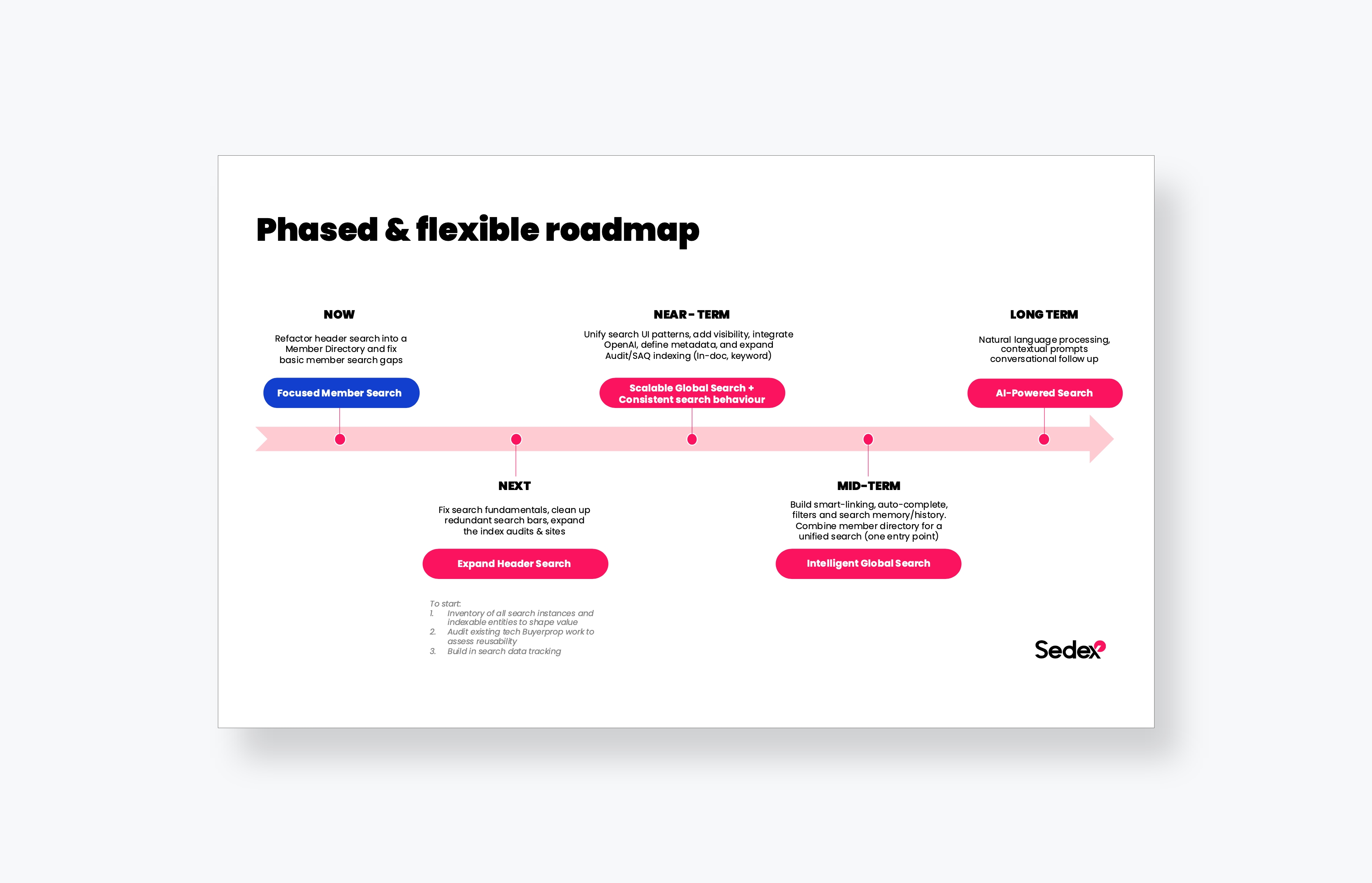 In 2025, Sedex was seeking ways to maintain its industry leadership position. They knew Search cold be better acros their global platform, but unsure wether incremental fixes to invest in a unifed search capability would best support future growth and corss product workflows. The questions they had was, 'How can we improve it? What should we do? '.